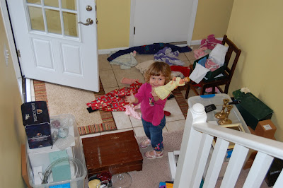 Marly found a true prize! One of my old barbies, along with doll clothes, and a dolly baby blanket my mom had made. Next to her feet is the box of Melberg/Nelson family silver.